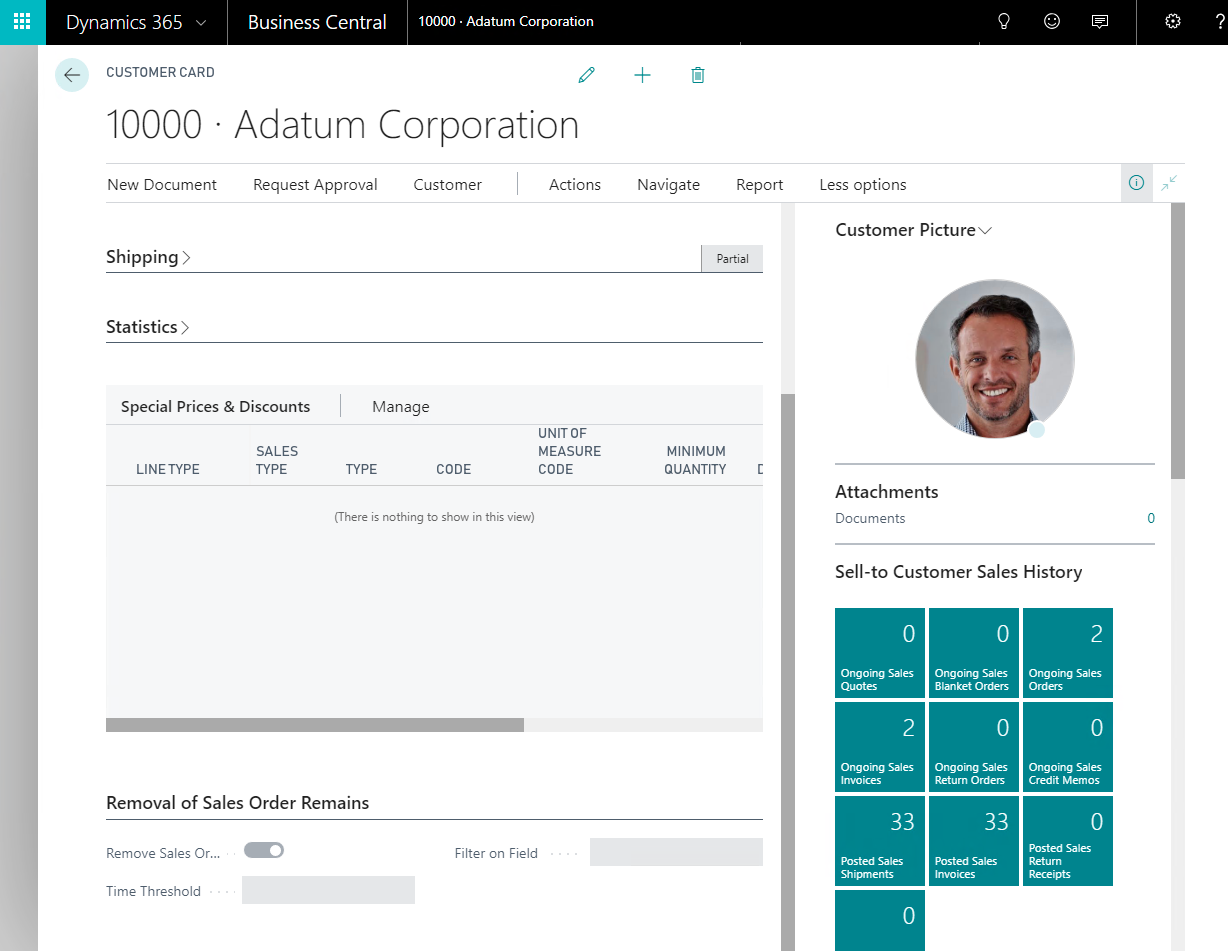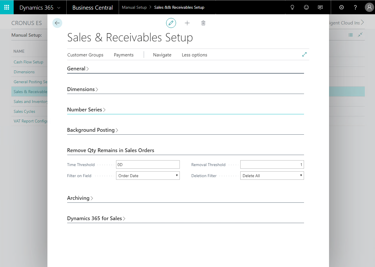 It is also possible to access this card by navigating to the sales and receivables setup, where we will have available a new block of fields available with the title "Removal of remain in sales orders".