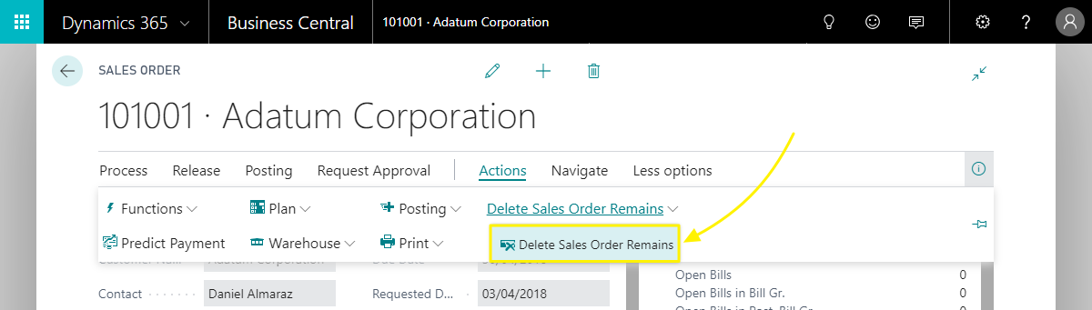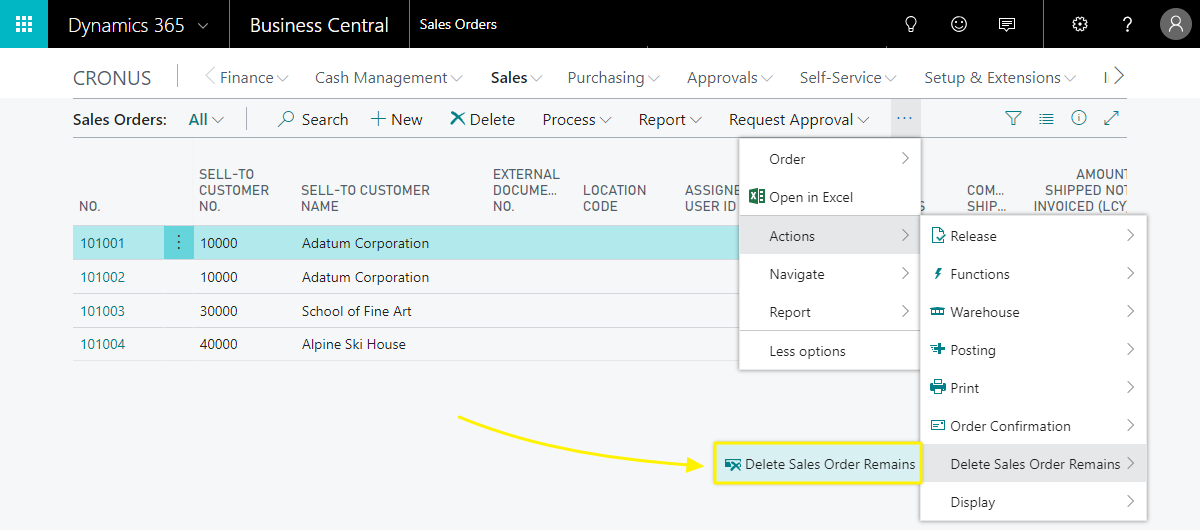 - Automatically, by scheduling the task Removal of Sales Order Remains from the Microsoft Dynamics 365 Business Central project queue.